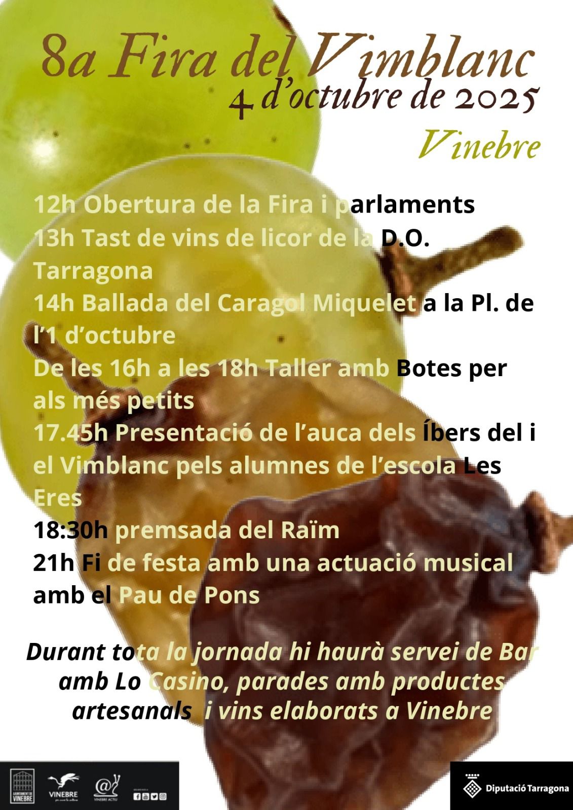 El pròxim 4 d’octubre a Vinebre es celebrarà la 8a Fira del Vimblanc de Vinebre. El vi dolç tradicional del municipi, és únic, dolç, fet amb panses i envellit a les cases.