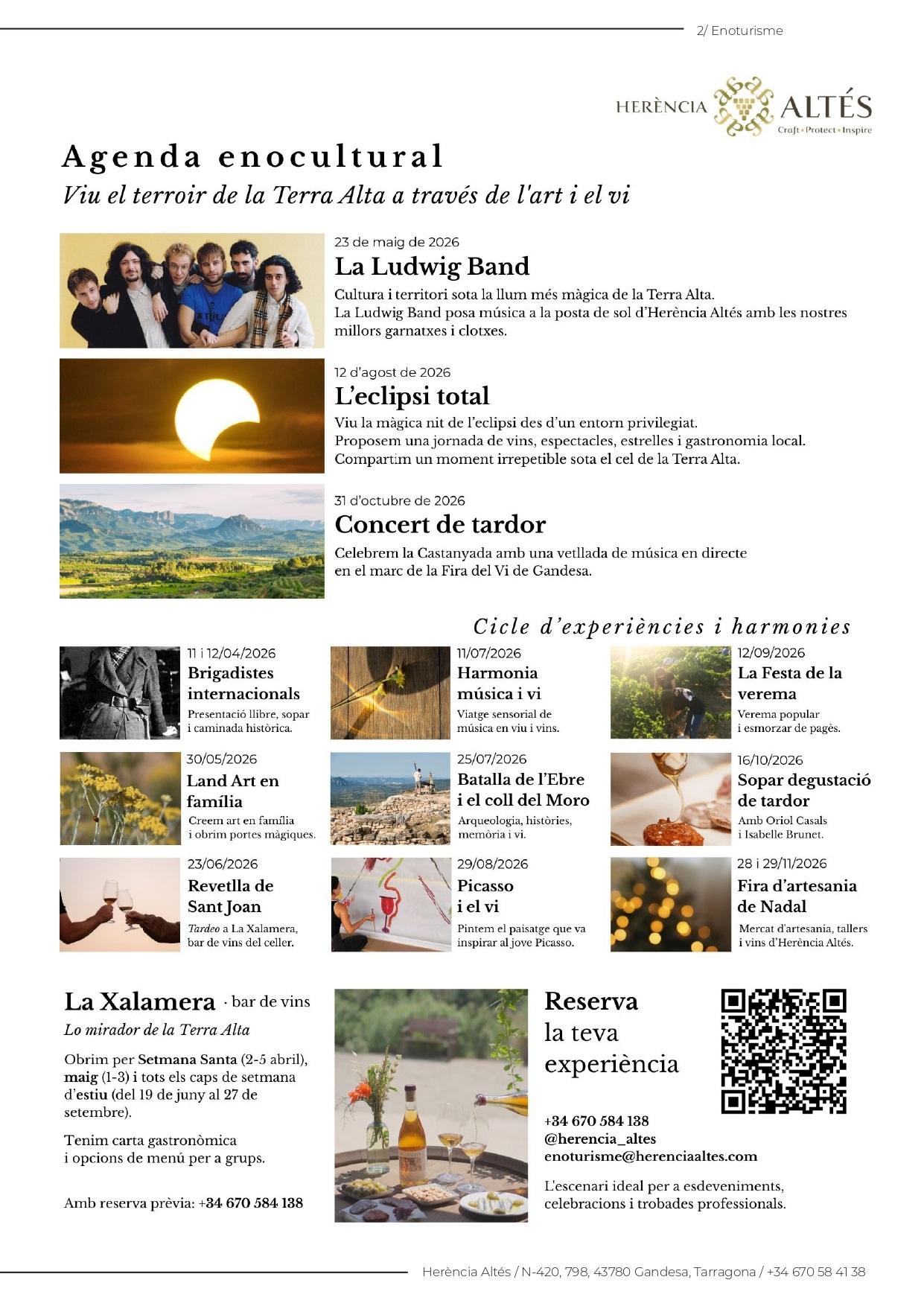 El Celler Herència Altés ofereix una agenda cultural i d'esdeveniments per a aquest any, que inclou fites com els concerts entre vinyes (properament, La Ludwig Band) o l’experiència astronòmica única de l’Eclipsi Solar del 12 d’agost.