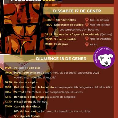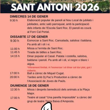 El programa de les festes, pensat per a totes les edats, ofereix la XII Ruta Tapa Porca, les Completes solemnes, la XXI Festa de la Clotxa, la inauguració de la revalorització de l’Aubadera, benediccions tradicionals i un homenatge sentit a la pagesia, acompanyats d’exposicions, concerts benèfics
