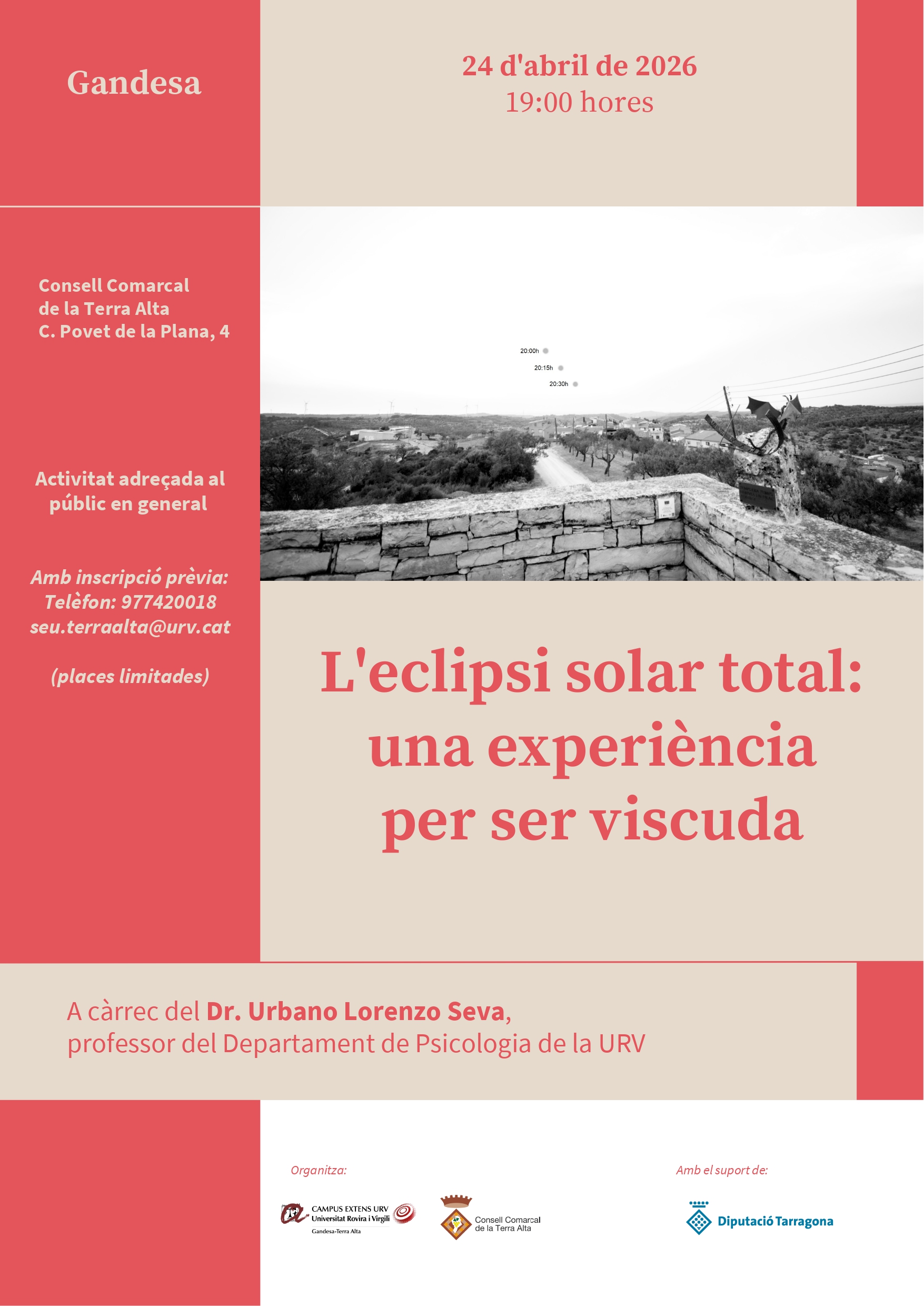 En aquesta xerrada divulgativa es donaran consells sobre quin és el lloc més adequat per veure'l i s'oferiran pautes per fer una observació segura i sense perill per als ulls. Conduirà l'activita Urbano Lorenzo, catedràtic de Metodologia de les Ciències del Comportament de la URV.