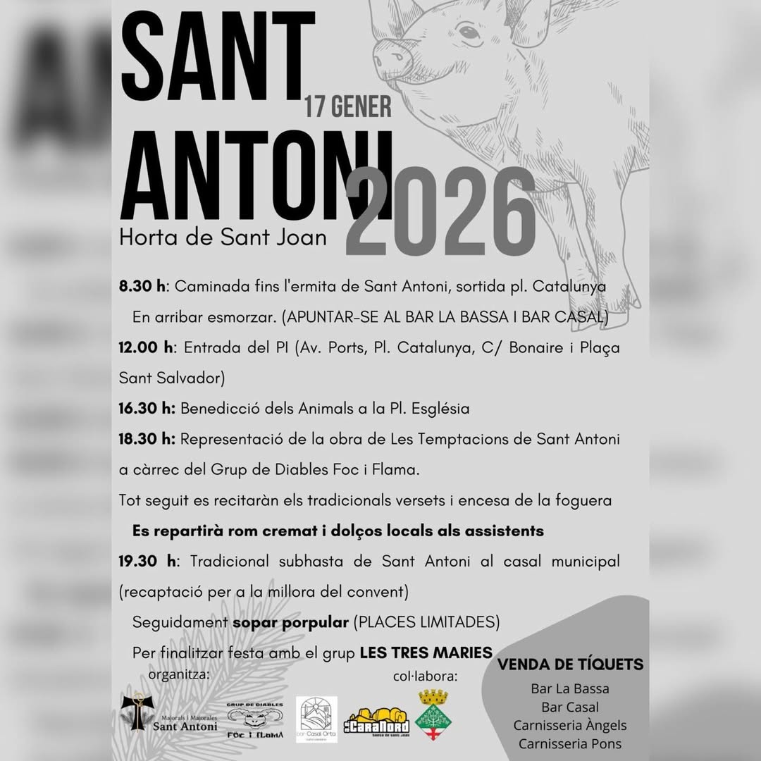 Celebració de la festa de Sant Antoni amb un dia ple d'actes tradicionals, caminada fins a l'ermita de Sant Antoni, esmorzar, benedicció dels animals, encesa de la foguera i subhasta.