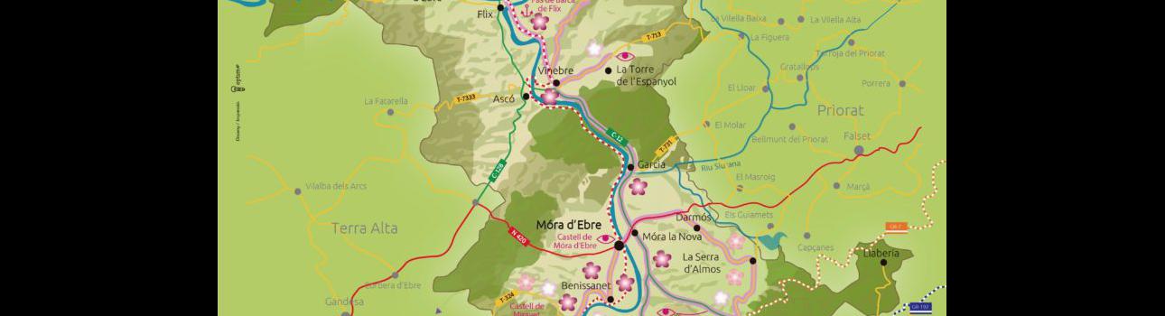 Una de les formes de gaudir de la floració a la Ribera d’Ebre és a través de rutes en cotxe o touring. En aquest enllaç podreu descarregar-vos un mapa on podreu visualitzar les carreteres i les pistes que permeten admirar els paisatges en flor de la comarca, així com també aquells punts que permeten observar les millors vistes panoràmiques. El mapa permet distingir les diferents zones de floració de la comarca en funció de l’espècie: l’ametller, el presseguer o el cirerer. www.turismeriberaebre.org/proposta/floracio-ribera-ebre/