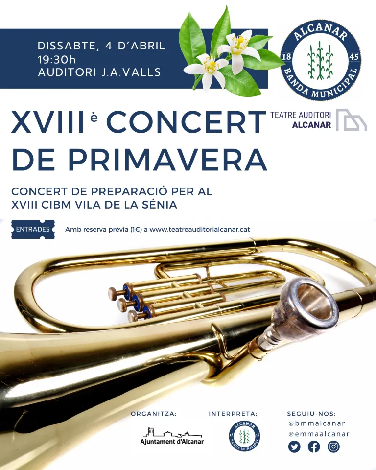 El próximo sábado 4 de abril, a partir de las 19:30h, tendrá lugar en el Teatro Auditorio José Antonio Valls Subirats la XVIII edición del Concierto de Primavera de la Banda Municipal de Música de Alcanar.