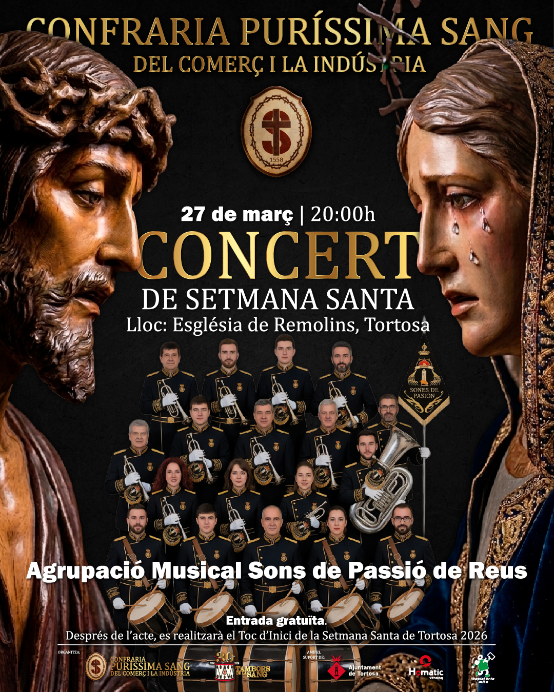 La Semana Santa de Tortosa 2026 arrancará con un emotivo concierto de la Agrupación Musical Sons de Passió de Reus, que ofrecerá una velada llena de tradición y sensibilidad para preparar los días centrales de la celebración. El acto, organizado por la Cofradía Purísima Sang del Comercio y la Industria.