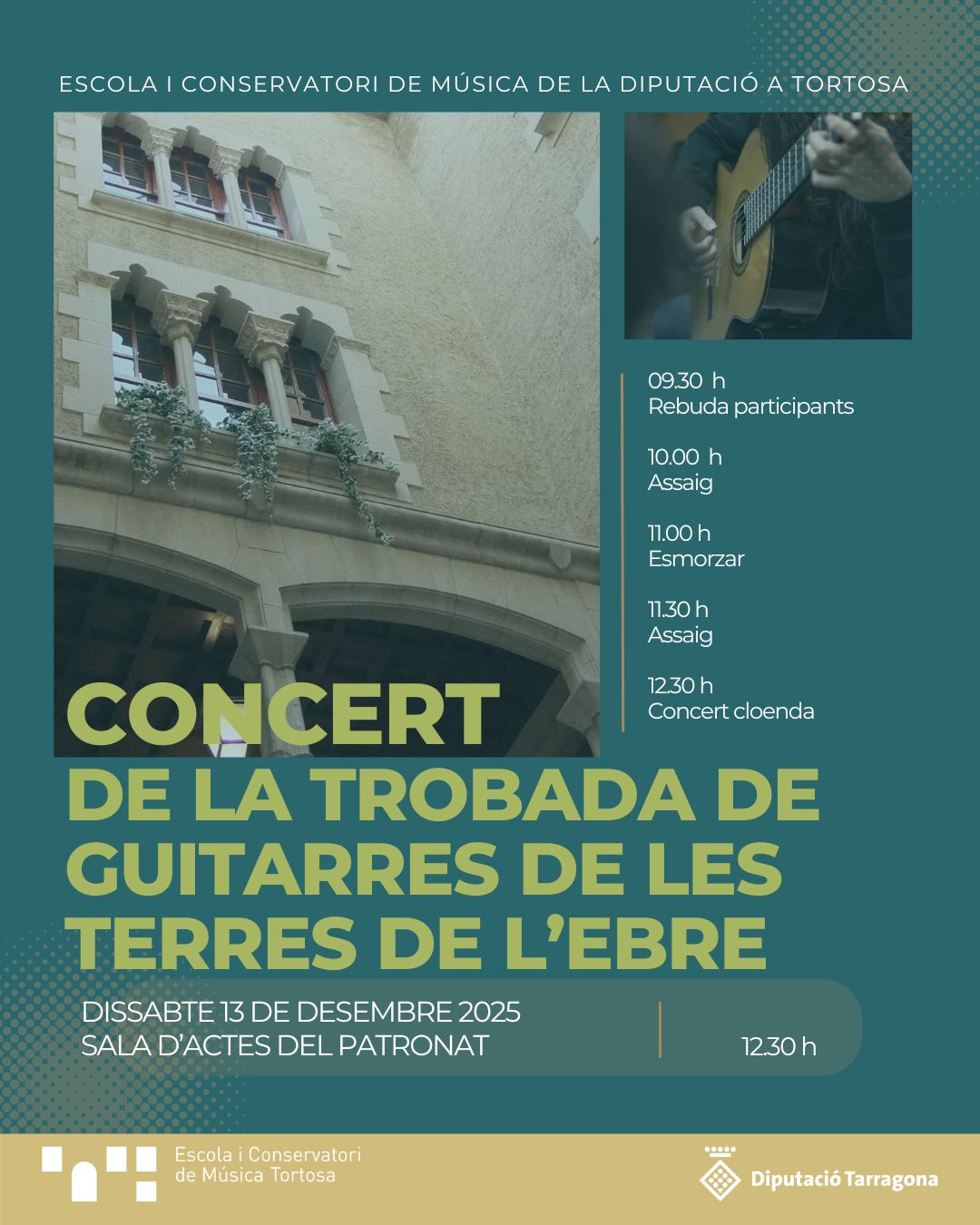 El Conservatorio y Escuela de Música de la Diputación en Tortosa será el escenario, el sábado 13 de diciembre de 2025, del Encuentro de Guitarras de las Terres de l'Ebre.