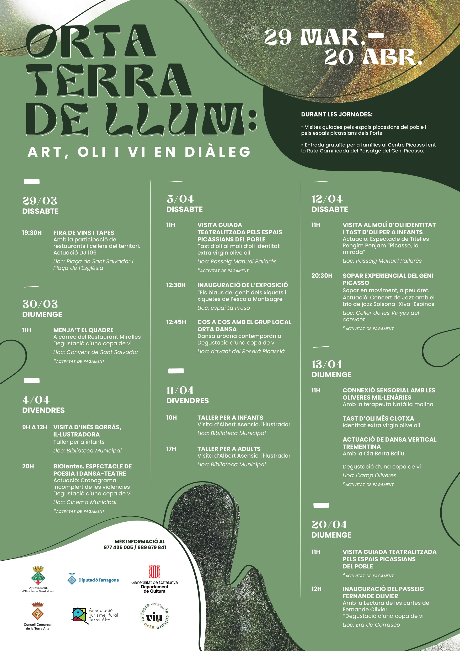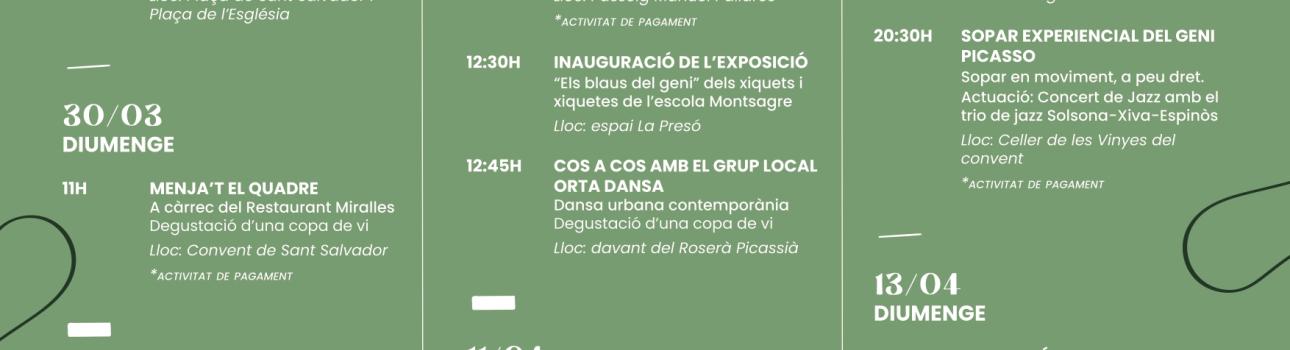 Jornadas culturales en torno a la figura de Pablo Picasso, inspiradas en sus obras y en los espacios donde se inspiró en Orta. Puede realizar visitas guiadas, catas de vinos y aceites o disfrutar de espectáculos varios.