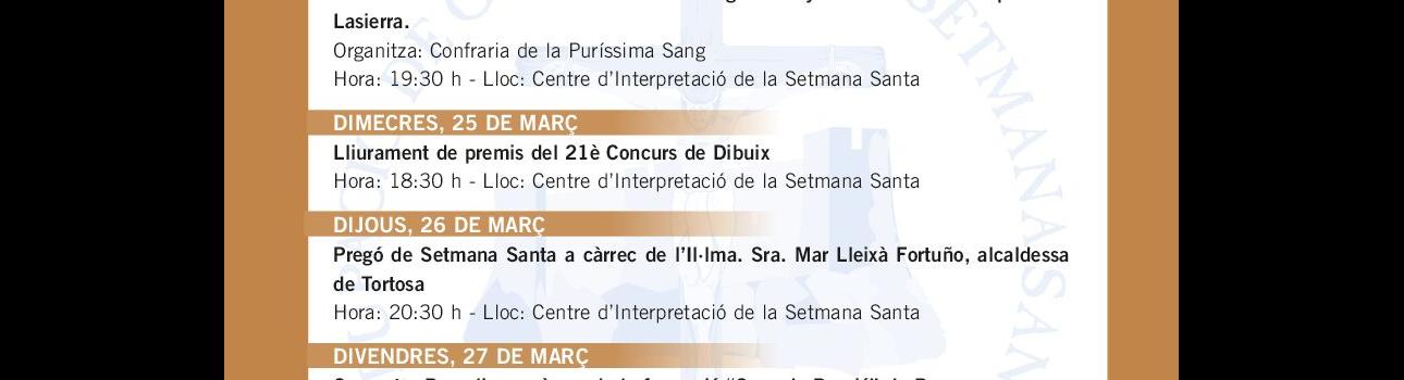 La Semana Santa de Tortosa reserva la parte más destacada a las cuatro procesiones de la Semana Santa de la ciudad, en la del Domingo de Ramos la seguirán las del Silencio, la medianoche del Jueves Santo; y las del Santo Entierro, en Tortosa y en Jesús, el Viernes Santo. El programa incluye diversas conferencias relacionadas con los elementos y símbolos de la Semana Santa de Tortosa.