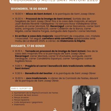 La Comisión de Sant Antoni, con la colaboración del Ayuntamiento de la Rápita, programa un conjunto de actos para celebrar la festividad de San Antonio en la Rápita el próximo fin de semana.