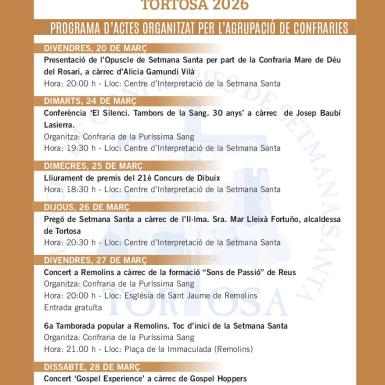 La Setmana Santa de Tortosa programa diverses activitats,un via creu, Divendres Sant a la plaça dels Dolors, dos concerts, a la catedral i a l'església dels Dolors, i el pregó de Josep Borrell, els actes del programa.
