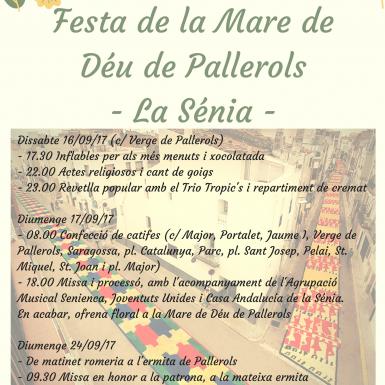 Dissabte dia 16, al carrer Verge dels Pallerols. 17.30h Inflables, 22h actes religiosos i a les 23h Revetlla popular amb el Trio Tropic's i repartiment de cremat.