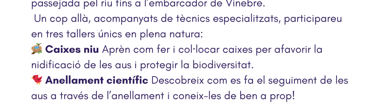 Aventura en la Laguna de Ascó. Embarcará a bordo del Roget hasta el embarcadero de Vinebre. Participará en 3 talleres; cajas nido, anillamiento científico y pesca eléctrica.