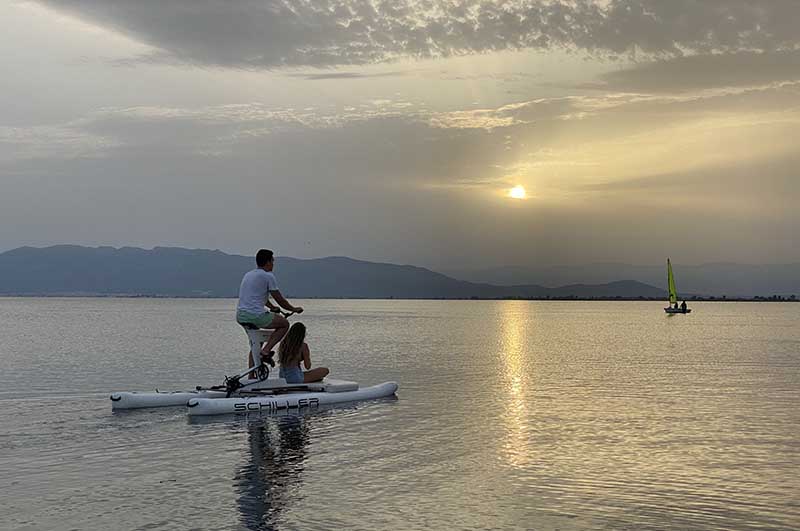 Parcourez les eaux de la baie des Alfacs à vélo aquatique Pédaler sur les eaux de la baie des Alfacs avec un vélo aquatique est l’une des expériences les plus agréables et exaltantes à vivre au Trabucador. Nous l’avons préparée avec le plus grand soin pour que votre séjour touristique chez nous soit inoubliable.